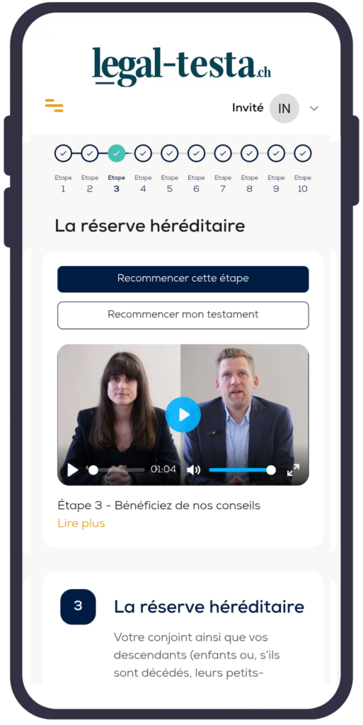 Grâce à notre expertise, vous pouvez créer un testament suisse simple, sécurisé et conforme à la loi, directement en ligne. Vous aurez accès au générateur de testament conforme au droit suisse. Nous vous guidons tout au long du parcours au moyen de vidéos facilement compréhensibles.